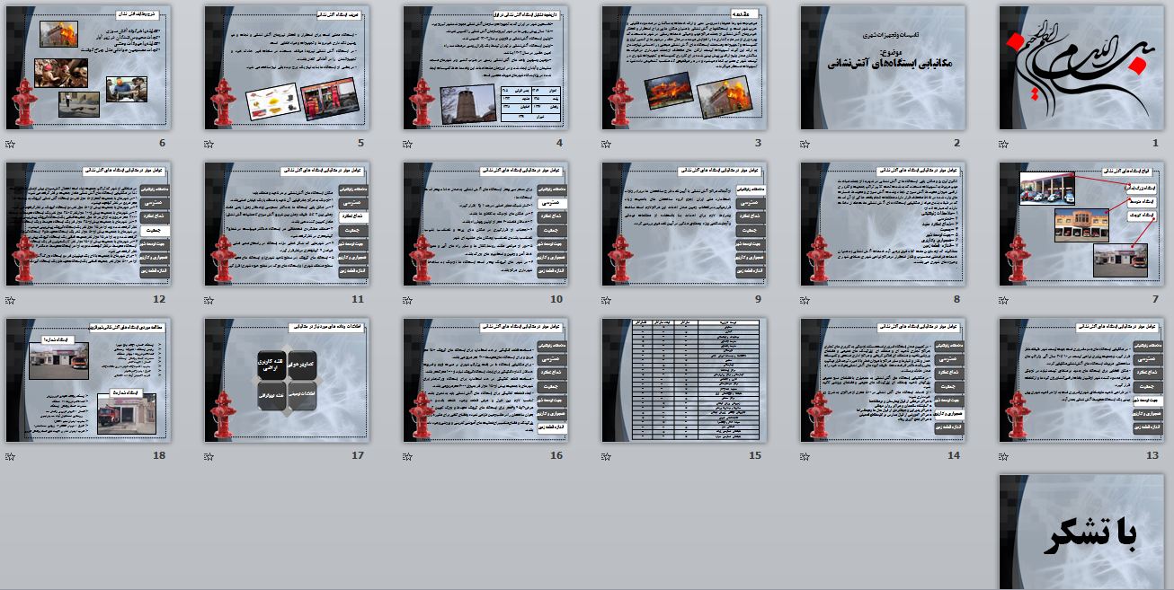 در این بخش پاورپوینت تاسیسات و تجهیزات شهری با موضوع مکانیابی ایستگاههای آتشنشانی در 19 اسلاید برای دانلود قرار داده شده است. در ذیل پیشنمایشی از آن آورده شده است.